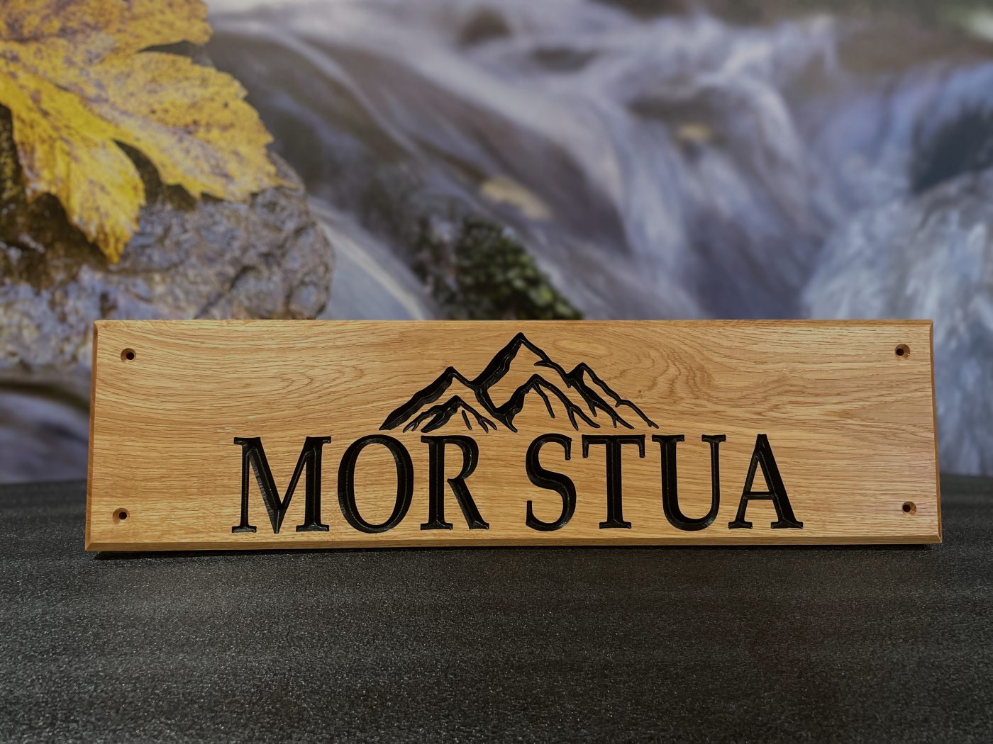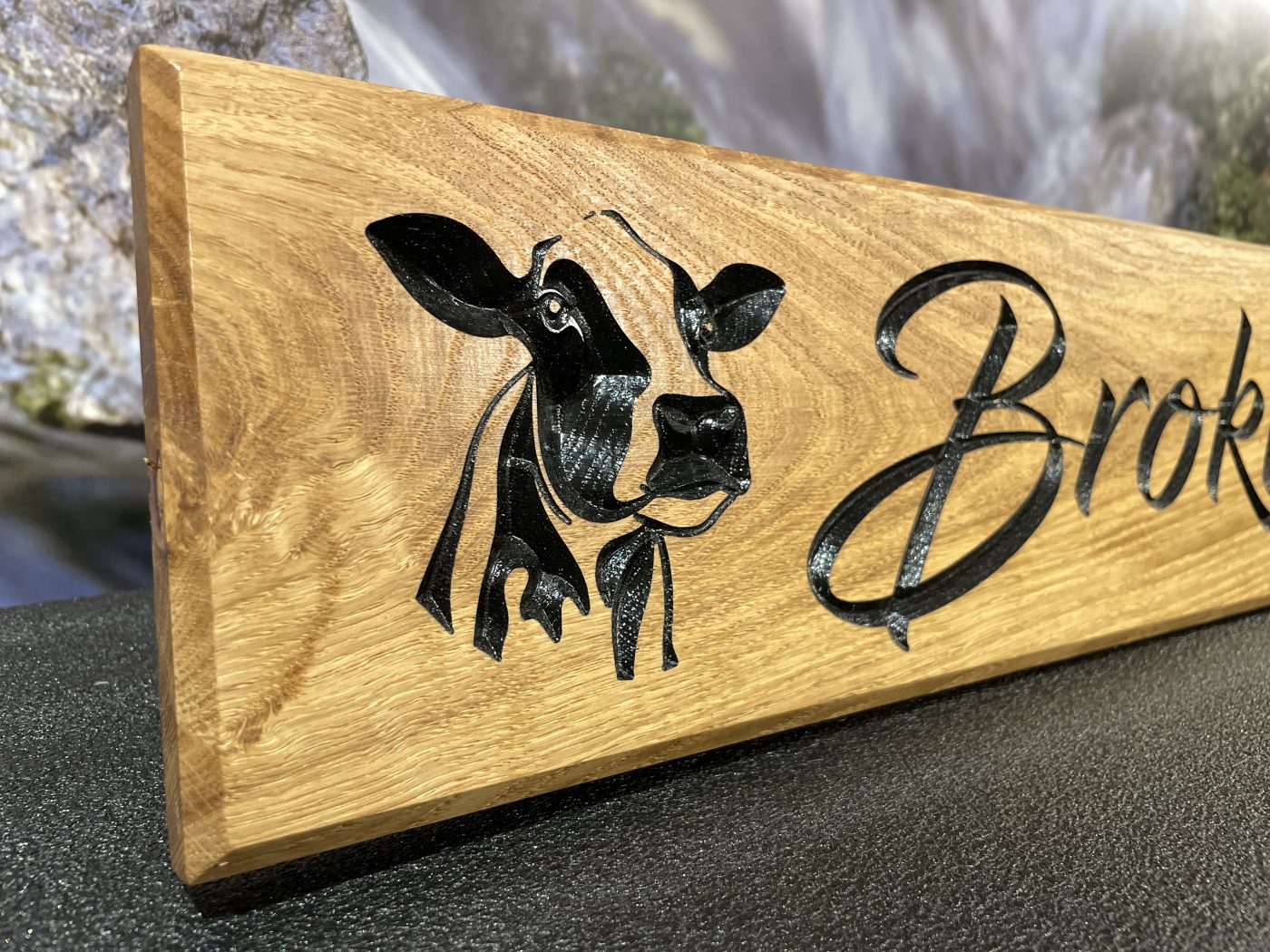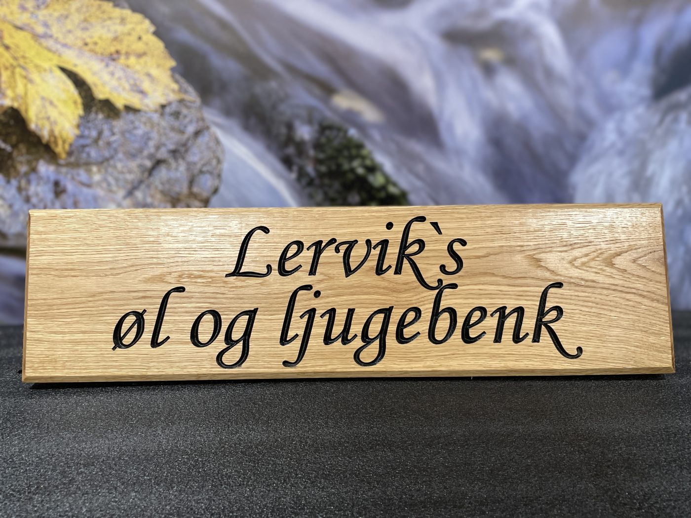 Gi hytta eller huset ditt et personlig preg med et solid og tidløst eikeskilt. Våre skilt lages i heltre eik fra Sangesland, høvlet på Katerås i Iveland og ferdig pusset og tilpasset i vårt verksted i Vennesla. Hvert skilt freses med høy presisjon, der bokstavene inngraveres og males for et tydelig og varig uttrykk som står godt til den naturlige eikestrukturen. For å sikre at skiltet tåler vær og vind, blir det behandlet med tre strøk Danish Oil. Resultatet er en vakker, matt overflate som fremhever treets årringer og gir lang levetid, selv når skiltet henger utendørs året rundt.