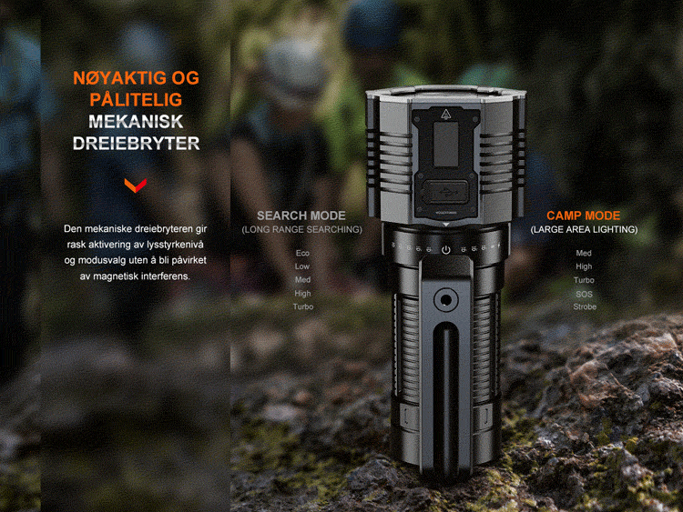 - Søkemodus og Camp-modus sørger for ulike lysbehov. Søkemodusen kan brukes til langdistansesøk mens Camp-modusen er flott for belysning av store områder.
