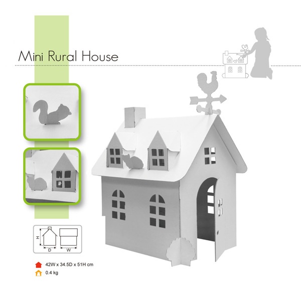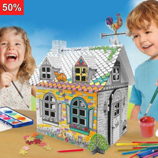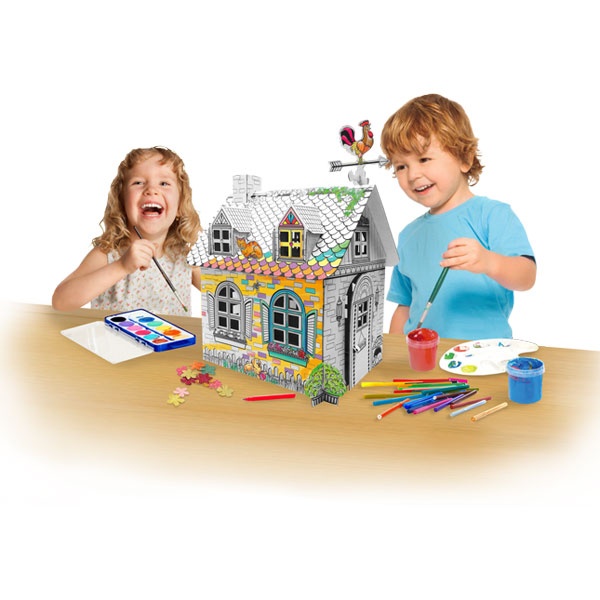 La barna bruke fantasien og designe sitt eget lekehus. Lekehuset er produsert av resirkulert papp for maling eller fargelegging med blyant i flotte farger. Det medfølger enkle monterings instruksjoner og monteres uten bruk av lim eller verktøy.